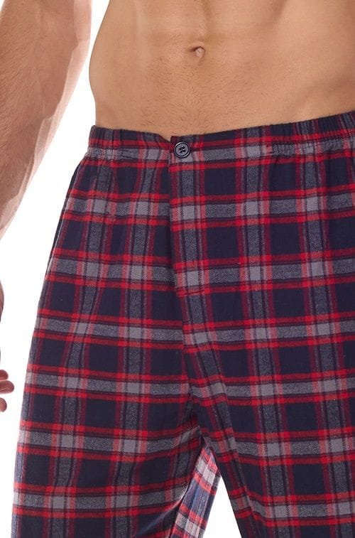 Piżama z miękkiej, ciepłej flaneli w kratę. Koszula z długim rękawem, kołnierzykiem, rozpinana. Spodnie z długą, prostą nogawką i praktycznymi kieszeniami po bokach. Skład: 100% bawełna.