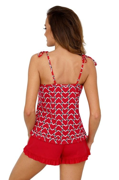 Czerwona, dwuczęściowa piżama damska z bluzeczką w serduszka. Wyróżnia się ślicznym, kobiecym krojem, w którym ramiączka są wiązane na ramionach. Dekolt wspaniale podkreśla górne partie ciała jednocześnie zapewniając poczucie komfortu i wygody. W zestawie gładkie szorty wykończone mini falbanką wokół ud. Produkt wysokiej jakości pakowany w pudełeczko z bibułką w środku. Skład: 100% bawełna.