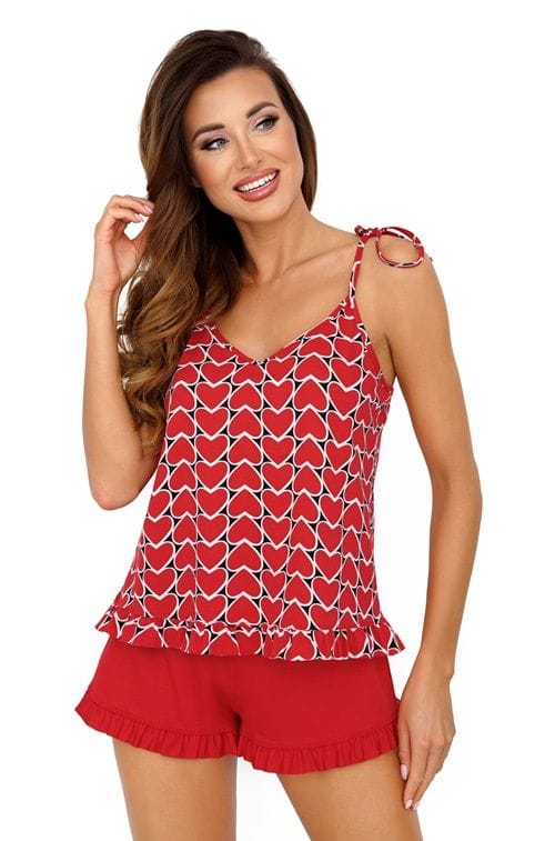 Czerwona, dwuczęściowa piżama damska z bluzeczką w serduszka. Wyróżnia się ślicznym, kobiecym krojem, w którym ramiączka są wiązane na ramionach. Dekolt wspaniale podkreśla górne partie ciała jednocześnie zapewniając poczucie komfortu i wygody. W zestawie gładkie szorty wykończone mini falbanką wokół ud. Produkt wysokiej jakości pakowany w pudełeczko z bibułką w środku. Skład: 100% bawełna.