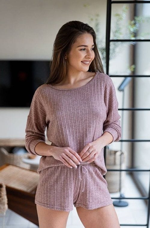 - Jeśli kochasz miękką, sweterkową dzianinę ten komplecik przypadnie Ci do gustu. Zestaw jest dwuczęściowy wykonany z miękkiej dzianiny wiskozowej, świetnie sprawdzi się również w roli homweara. Bluzka o migdałowym dekolcie, lekko opada na ramiona. Spodenki luźne, zwiewne, ze sznureczkiem w pasie. Komplet możesz nosić jako jedną całość bądź dowolnie miksować z innymi elementami garderoby - w takim wydaniu również świetnie się sprawdzi. Skład: 52% wiskoza, 26% poliester, 22% poliamid.