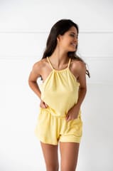 Dwuczęściowy komplet w ślicznym, słonecznym kolorze, który sprawdzi się zarówno jako homewear, piżama jak i komplecik na lato. Wykonany z przyjemnej w dotyku dzianiny, świetny w zestawie, doskonale sprawdza się również w połączeniu z innymi elementami garderoby. Bluzka z wiązaniem wokół szyi. Krój luźny, wygodny. Szorty z kieszonkami, na miękkiej gumie w pasie. Skład: 50% wiskoza, 25% poliester, 25% poliamid.