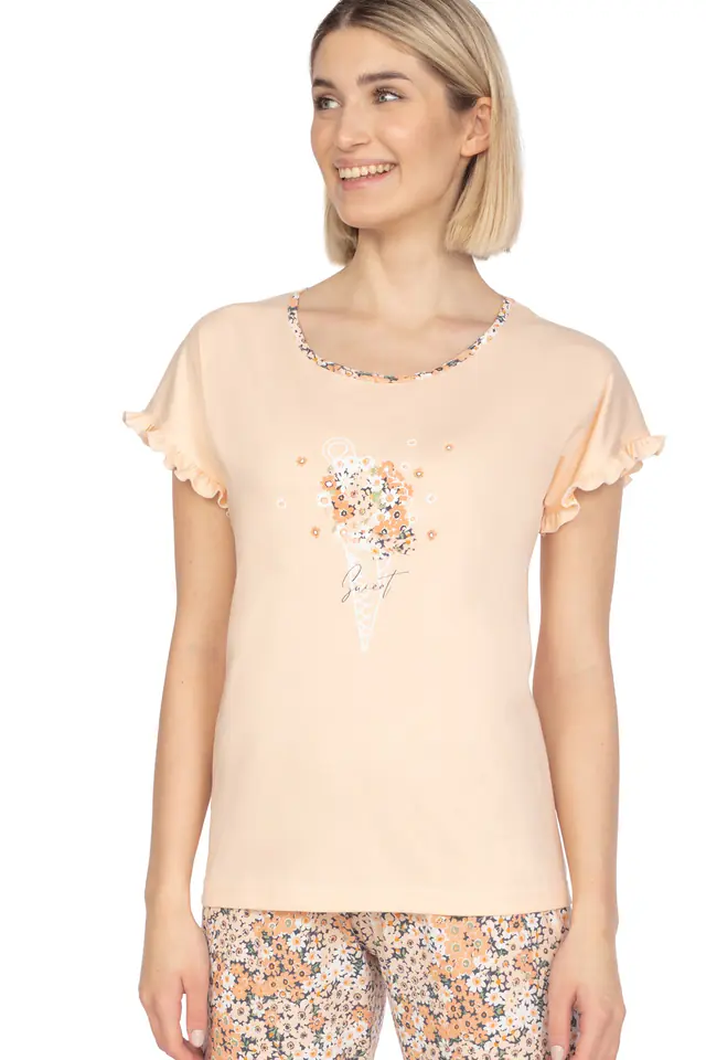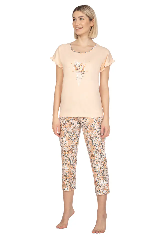 Piżama damska wykonana z wysokiej jakości bawełny. Koszulka z krótkim rękawem, ozdobniona nadrukiem. Wzorzyste spodnie typu rybaczki. Skład:100% bawełna.