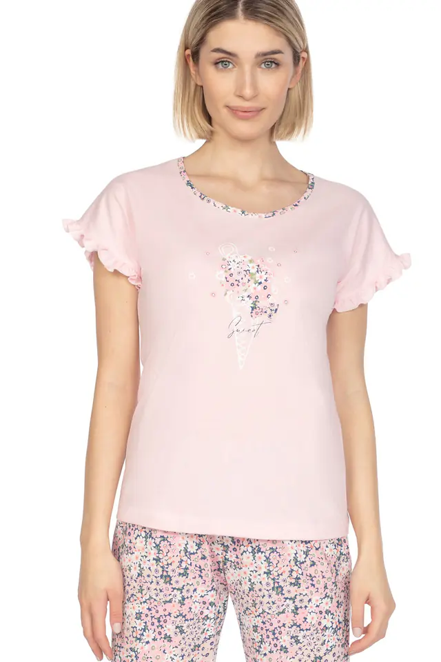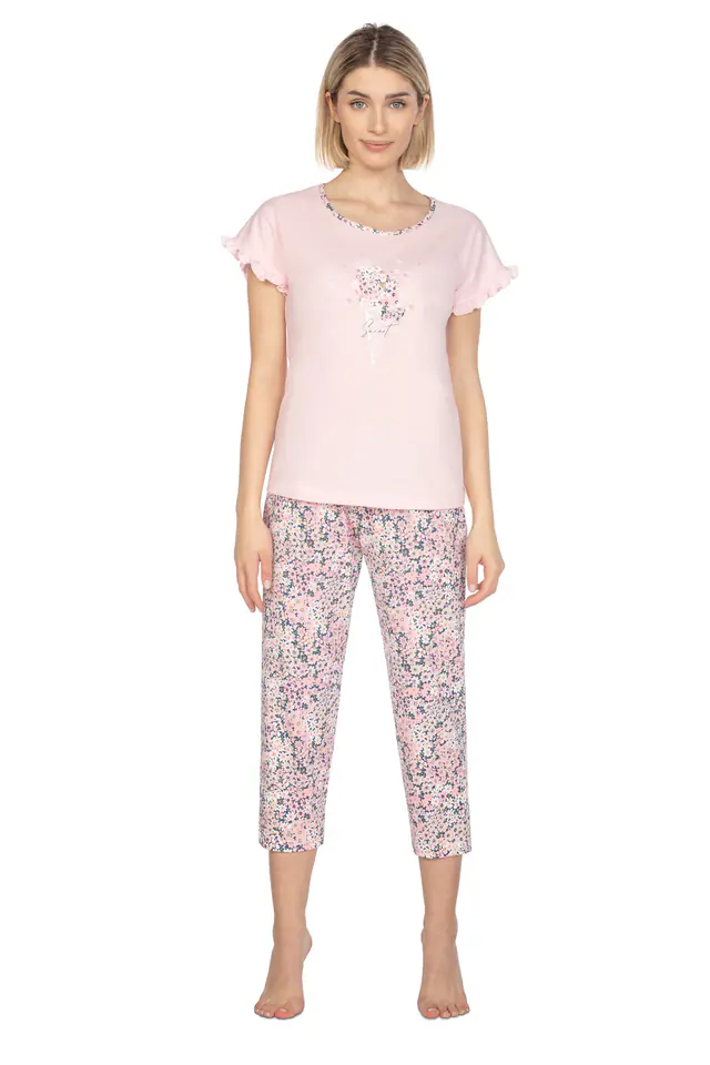 Piżama damska wykonana z wysokiej jakości bawełny. Koszulka z krótkim rękawem, ozdobniona nadrukiem. Wzorzyste spodnie typu rybaczki. Skład:100% bawełna.