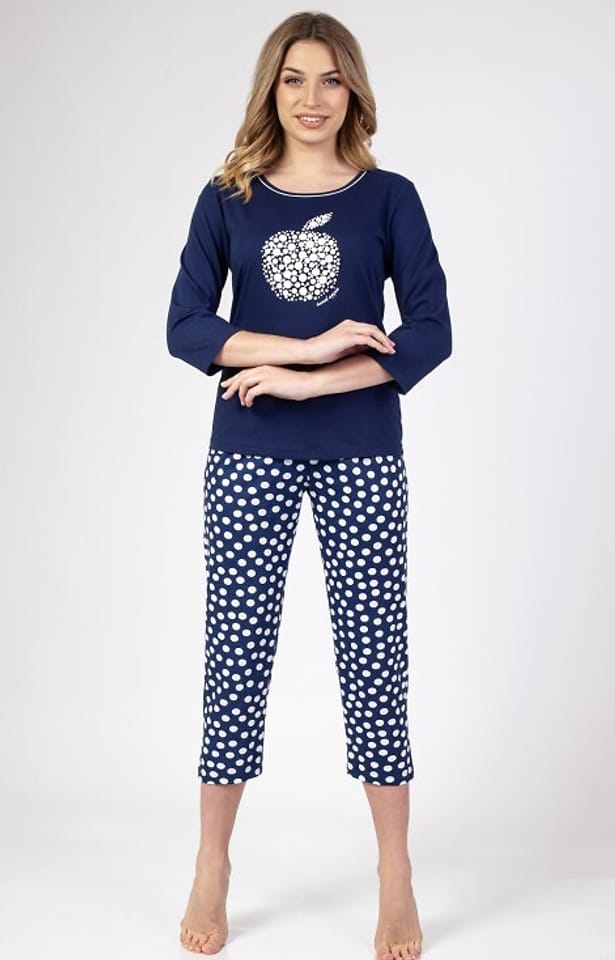 Piżama damska wykonana z wysokiej jakości bawełny. Koszulka z rękawem 3/4, z półokrągłym dekoltem i ozdobnym nadrukiem z przodu. Spodnie wzorzyste, długość do łydki. Skład: 100% bawełna.