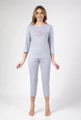 Bawełniana piżama damska z kolorowym, delikatnym nadrukiem na przodzie. Koszulka z rękawem 3/4 i półokrągłym dekoltem ozdobionym małą kokardką. Spodnie jednolite, długość do łydki. Skład: 100% bawełna.