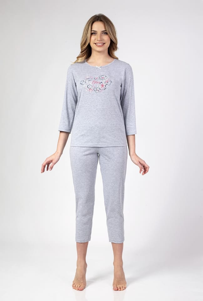 Bawełniana piżama damska z kolorowym, delikatnym nadrukiem na przodzie. Koszulka z rękawem 3/4 i półokrągłym dekoltem ozdobionym małą kokardką. Spodnie jednolite, długość do łydki. Skład: 100% bawełna.