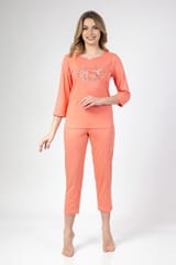 Bawełniana piżama damska z kolorowym, delikatnym nadrukiem na przodzie. Koszulka z rękawem 3/4 i półokrągłym dekoltem ozdobionym małą kokardką. Spodnie jednolite, długość do łydki. Skład: 100% bawełna.