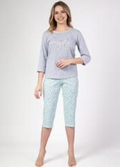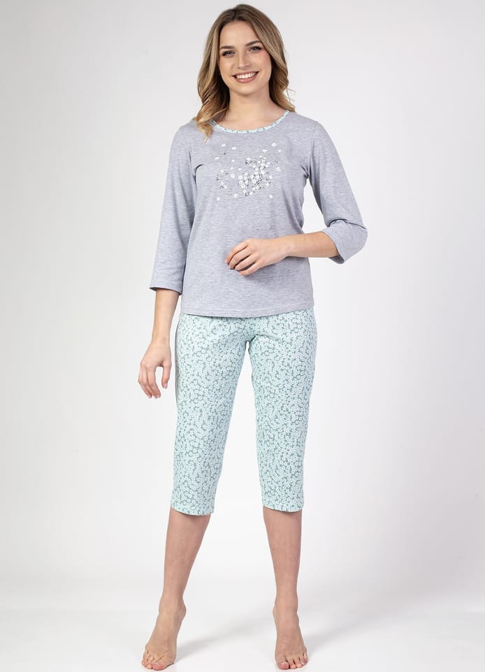 Piżama damska wykonana z wysokiej jakości bawełny. Koszulka z rękawem 3/4, z półokrągłym, dekoltem i ozdobnym nadrukiem z przodu. Spodnie wzorzyste, długość do łydki. Skład: 100% bawełna.