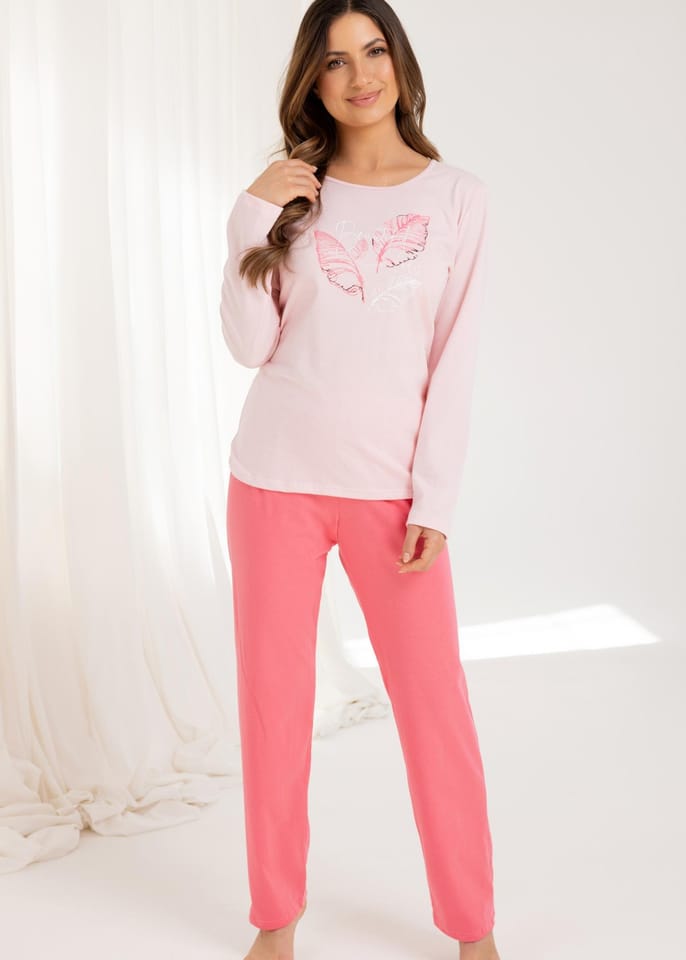 Piżama damska z wysokiej jakości bawełny. Koszulka z długim rękawem i okrągłym dekoltem, na wysokości piersi delikatny nadruk. Spodnie długie, jednolite z gumką w pasie. Skład: 100% bawełna.