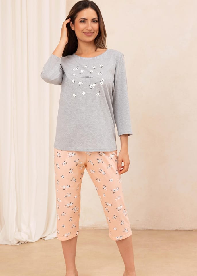 Bawełniana piżama damska. Koszulka z półokrągłym dekoltem i rękawem 3/4, z przodu ozdobny kwiatowy print. Do kompletu spodnie wzorzyste o długości 3/4. Skład: 100% bawełna.
