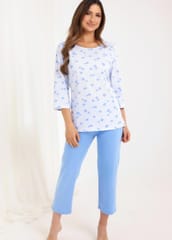 Bawełniana piżama damska. Koszulka wzorzysta z rękawem 3/4, dekolt półokrągły. Do kompletu spodnie jednolite o długość 7/8. Skład: 100% bawełna.