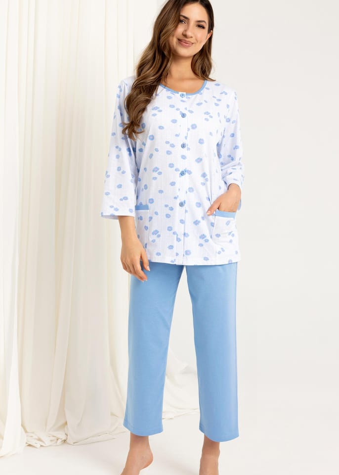 Piżama damska uszyta z wysokiej jakości bawełny. Koszulka w kwiaty zapinana na guziki, rękaw o długości 7/8, po bokach wygodne kieszenie. Spodnie przed kostkę, gładkie, z gumką w pasie. Skład: 100% bawełna.