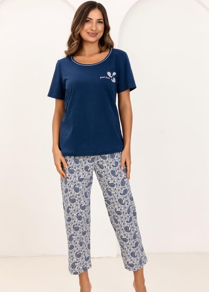 Bawełniana piżama damska o lekko luźnym kroju. Koszulka z krótkim rękawem,półokrągłym dekoltem i ozdobnym nadrukiem w kwiaty. Spodnie wzorzyste, długosci 7/8 z gumką w pasie obszytą bawełną. Skład: 100% bawełna.
