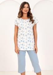 Bawełniana piżama damska zapewnia komfort termiczny i przyjemne uczucie na skórze. Koszulka w kolorowe kółka z krótkim rękawem i półokrągłym dekoltem delikatnie układa się na sylwetce. Do kompletu jednolite spodnie, długość 3/4. Skład: 100% bawełna.