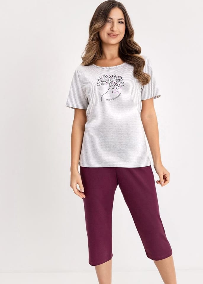 Bawełniana piżama damska zapewnia komfort termiczny i przyjemne uczucie na skórze. Koszulka w paski z krótkim rękawem i półokrągłym dekoltem z ozdobionym nadrukiem. Do kompletu jednolite spodnie, długość 3/4. Skład: 100% bawełna.