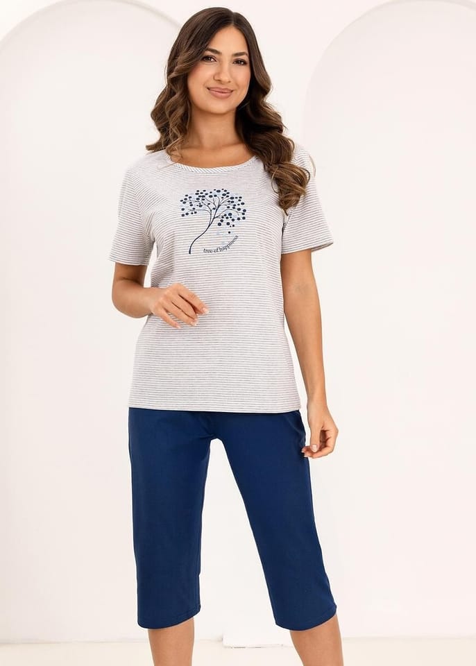 Bawełniana piżama damska zapewnia komfort termiczny i przyjemne uczucie na skórze. Koszulka w paski z krótkim rękawem i półokrągłym dekoltem z ozdobionym nadrukiem. Do kompletu jednolite spodnie, długość 3/4. Skład: 100% bawełna.