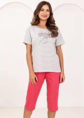 Bawełniana piżama damska zapewnia komfort termiczny i przyjemne uczucie na skórze. Koszulka w paski z krótkim rękawem i półokrągłym dekoltem z ozdobionym nadrukiem. Do kompletu jednolite spodnie, długość 3/4. Skład: 100% bawełna.