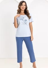 Bawełniana piżama damska, która jest miękka, przyjemna dla skóry i zapewnia komfort noszenia. Koszulka jednolita, z przodu ozdobiona nadrukiem, dekolt półokrągły. Do kompletu jednolite spodnie 7/8. Skład:100% bawełna.