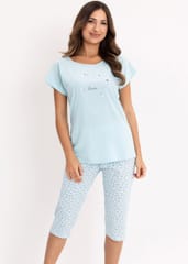 Bawełniana piżama damska zapewnia komfort termiczny i przyjemne uczucie na skórze. Koszulka z ozdobnym nadrukiem, krótkim rękawem i półokrągłym dekoltem delikatnie układa się na sylwetce. Do kompletu wzorzyste spodnie, długość 3/4. Skład: 100% bawełna.