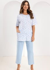Bawełniana piżama zapewnia doskonałą cyrkulację powietrza i pomaga utrzymać optymalną temperaturę ciała. Koszulka wzorzysta, zapinana na guziki, u dołu naszyte dwie kieszenie, krótki rękaw. Spodnie jednolite, o długości 7/8. Skład: 100% bawełna.