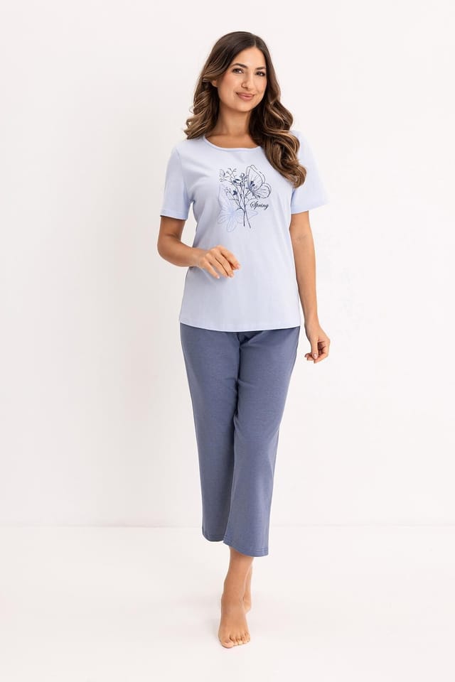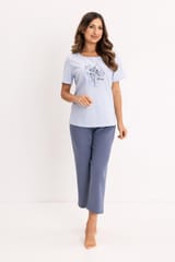 Bawełniana piżama damska zapewnia komfort termiczny i przyjemne uczucie na skórze. Koszulka z ozdobnym nadrukiem, z krótkim rękawem i półokrągłym dekoltem delikatnie układa się na sylwetce. Do kompletu jednolite spodnie, długość 7/8. Skład: 100% bawełna.