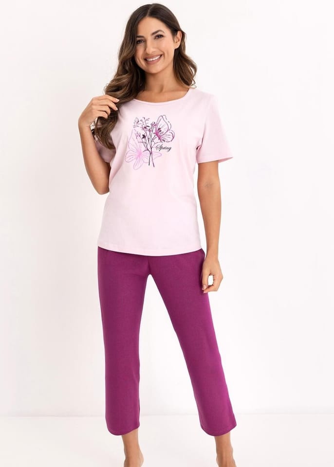 Bawełniana piżama damska zapewnia komfort termiczny i przyjemne uczucie na skórze. Koszulka z ozdobnym nadrukiem, z krótkim rękawem i półokrągłym dekoltem delikatnie układa się na sylwetce. Do kompletu jednolite spodnie, długość 7/8. Skład: 100% bawełna.