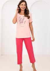 Bawełniana piżama damska zapewnia komfort termiczny i przyjemne uczucie na skórze. Koszulka z ozdobnym nadrukiem, z krótkim rękawem i półokrągłym dekoltem delikatnie układa się na sylwetce. Do kompletu jednolite spodnie, długość 7/8. Skład: 100% bawełna.