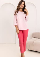 Bawełniana piżama damska zapewnia komfort termiczny i przyjemne uczucie na skórze. Koszulka zrękawem 3/4 i półokrągłym dekoltem delikatnie układa się na sylwetce. Do kompletu jednolite spodnie, długość 7/8. Skład: 100% bawełna.
