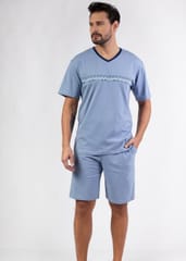 Piżama męska z wysokiej jakości bawełny. Koszulka z krótkim rękawem, dekoltem w kształcie litery Vi ozdobnym nadrukiem na piersi. Spodenki krótkie, jednolite. Skład: 100% bawełna.