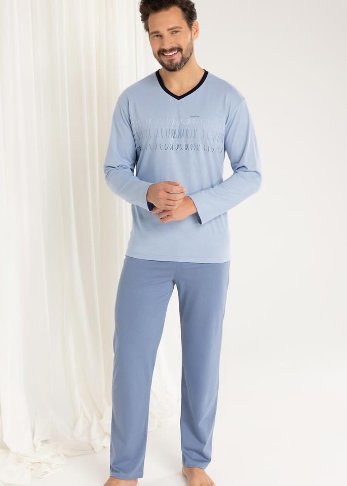 Bawełniana piżama męska. Koszulka z długim rękawem, dekolt w szpic i ozdobny druk na wysokości piersi. Do kompletu spodnie długie, jednolite i proste. Skład: 100% bawełna.