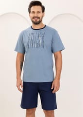 Bawełniana piżama męska- miękka, oddychająca i przyjazna dla skóry. Koszulka z krótkim rękawem, okrągłym dekoltem i nadrukiem umieszczonym na przodzie. Spodenki krótkie, jednolite z gumką obszytą bawełną. Skład: 100% bawełna.