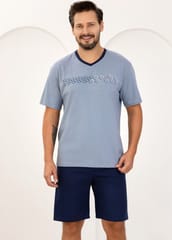 Bawełniana piżama męska- miękka, oddychająca i przyjazna dla skóry. Koszulka z krótkim rękawem, dekoltem w szpic i małym nadrukiem umieszczonym na przodzie. Spodenki krótkie, jednolite z gumką obszytą bawełną. Skład: 100% bawełna.