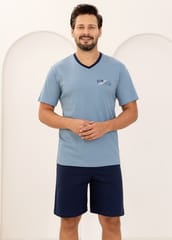 Bawełniana piżama męska- miękka, oddychająca i przyjazna dla skóry. Koszulka z krótkim rękawem, dekoltem w szpic i małym nadrukiem umieszczonym na przodzie. Spodenki krótkie, jednolite z gumką obszytą bawełną. Skład: 100% bawełna.