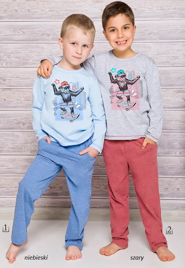 Piżama chłopięca uszyta z wysokiej jakości bawełny. Koszulka z długim rękawem, z przodu ozdobny nadruk. Do kompletu długie, melanżowe spodnie z kieszeniami w kontrastującym kolorze.