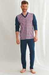 Piżama męska z wysokiej jakości bawełny. Bluza w kratkę z długim rękawem. Dekolt w kształcie litery V. Do kompletu jednolite spodnie. Skład: 100% bawełna.
