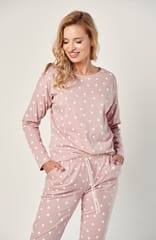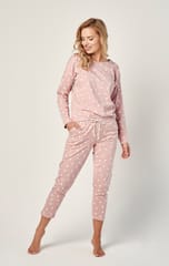 Piżama damska wzorzysta, wykonana z wysokiej jakości bawełny. Koszulka z długim rękawem z półokrągłym dekoltem. Spodnie o długości 7/8, z kieszeniami. W pasie gumka oraz regulacja na sznurek. Skład: 100% bawełna.