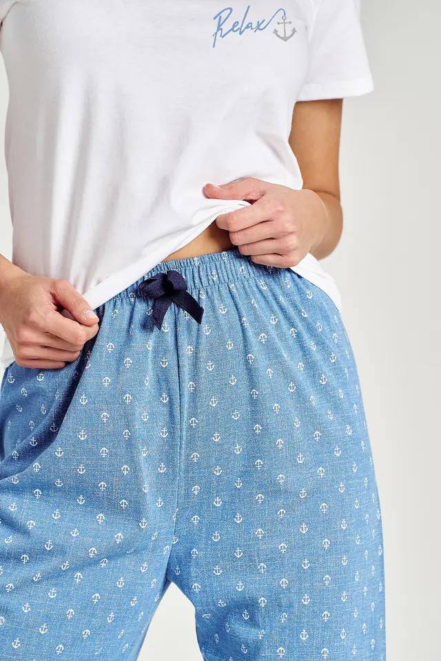 Piżama damska wykonana z wysokiej jakości bawełny.Koszulka z krótkim rękawem, na piersi delikatny nadruk.Długie spodnie, wzór w kotwice, w pasie ozdobna kokardka. Skład: 100% bawełna.