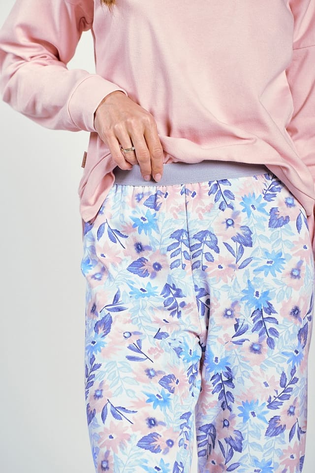 Piżama damska wykonana z wysokiej jakości bawełny. Bluza jednolita z długim rękawem i półokrągłym dekoltem, po bokach posiada delikatne rozcięcia i ściągacze na rękawach. Spodnie na gumce w kolorowe kwiaty. Skład: 100% bawełna.