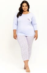 Piżama damska z wysokiej jakości bawełny.Koszulka z rękawem 3/4 i półokrągłym dekoltem, na piersi delikatny nadruk. Spodnie w delikatne kwiatuszki długości 7/8. Skład: 100% bawełna