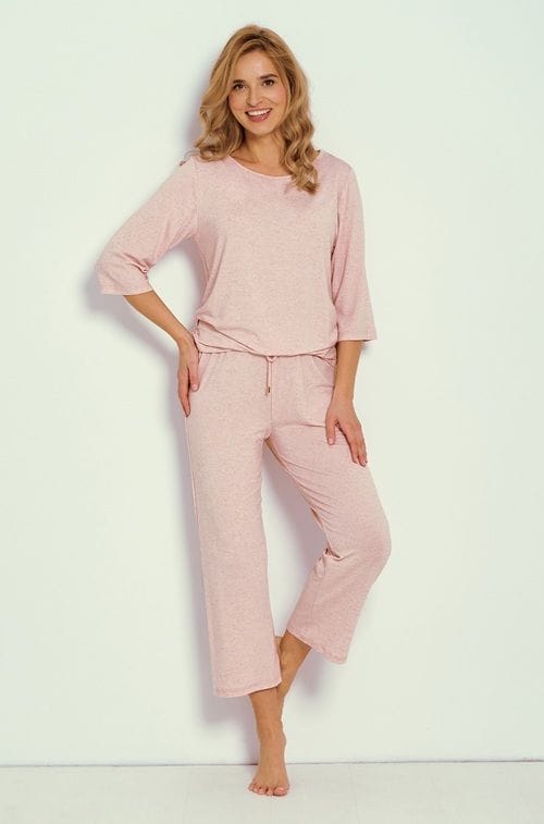Piżama damska z delikatnej wiskozy z dodatkiem lnu. Jednolita koszulka z rękawem 3/4 i półokrągłym dekoltem. Do kompletu spodnie typu rybaczki z ozdobnym wiązaniem w pasie. Skład: 75% wiskoza, 20% len, 5% elastan.