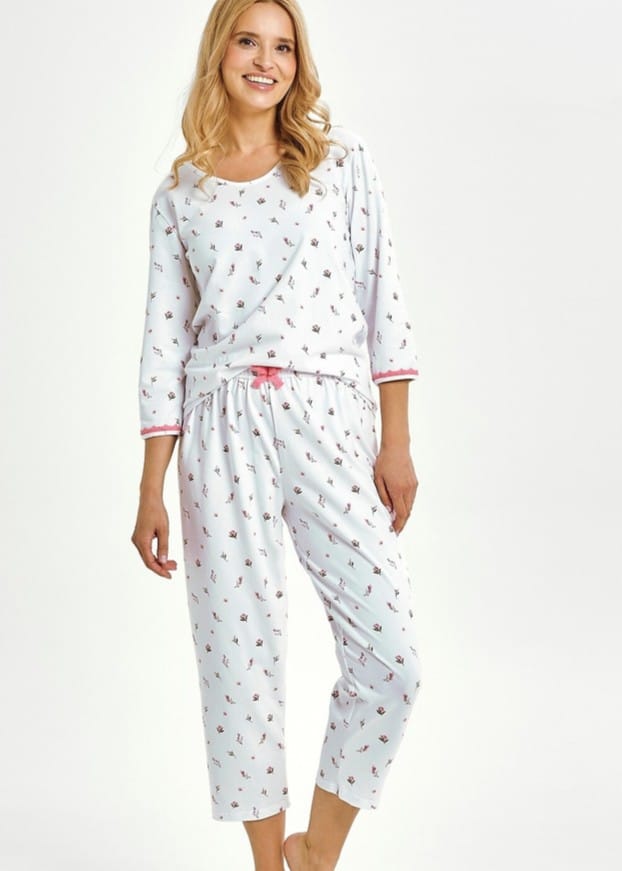 Elegancka, praktyczna i uniwersalna piżama damska dla kobiet, które cenią prostotę, wygodę i naturalne materiały.Bluzka z rękawem 3/4, mankiety zdobią koronkowe obszycia. Spodnie rybaczki. Skład: 100% bawełna.