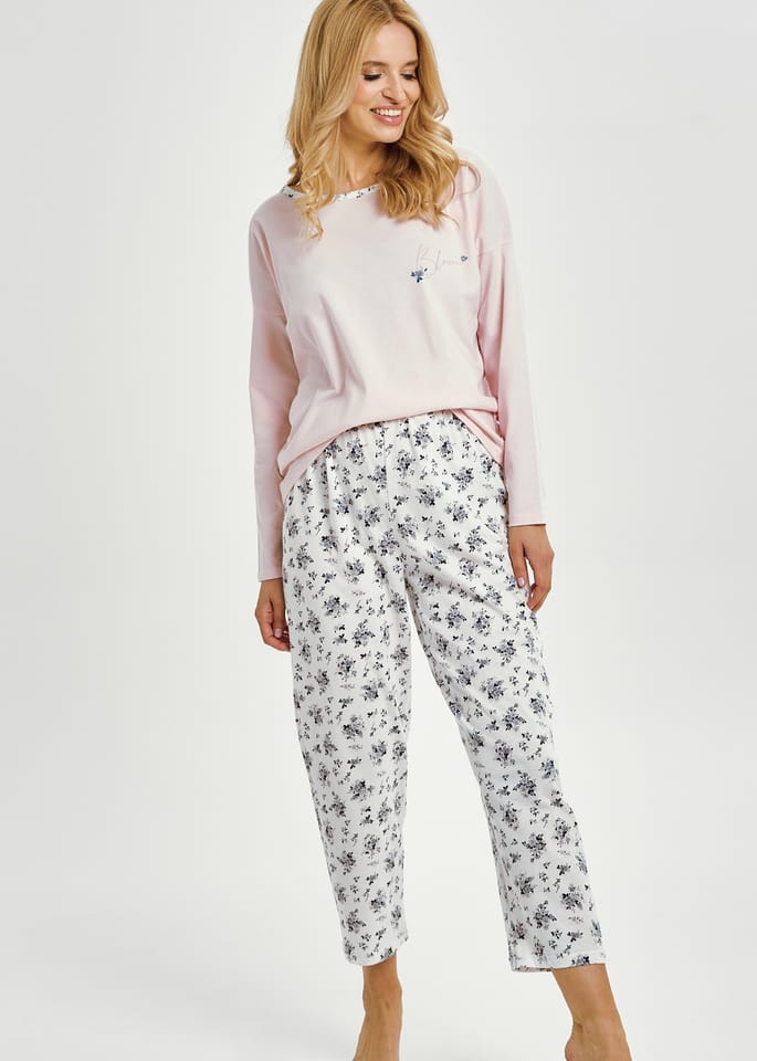 Bawełniana piżama damska. Koszulka z długim rękawem, półokrągłym dekoltem obszytym wzorzystą lamówką i delikatną grafiką na piersi. Spodnie w kwiatuszki, długość 7/8, w pasie wygodna gumka. Skład: 100% bawełna.