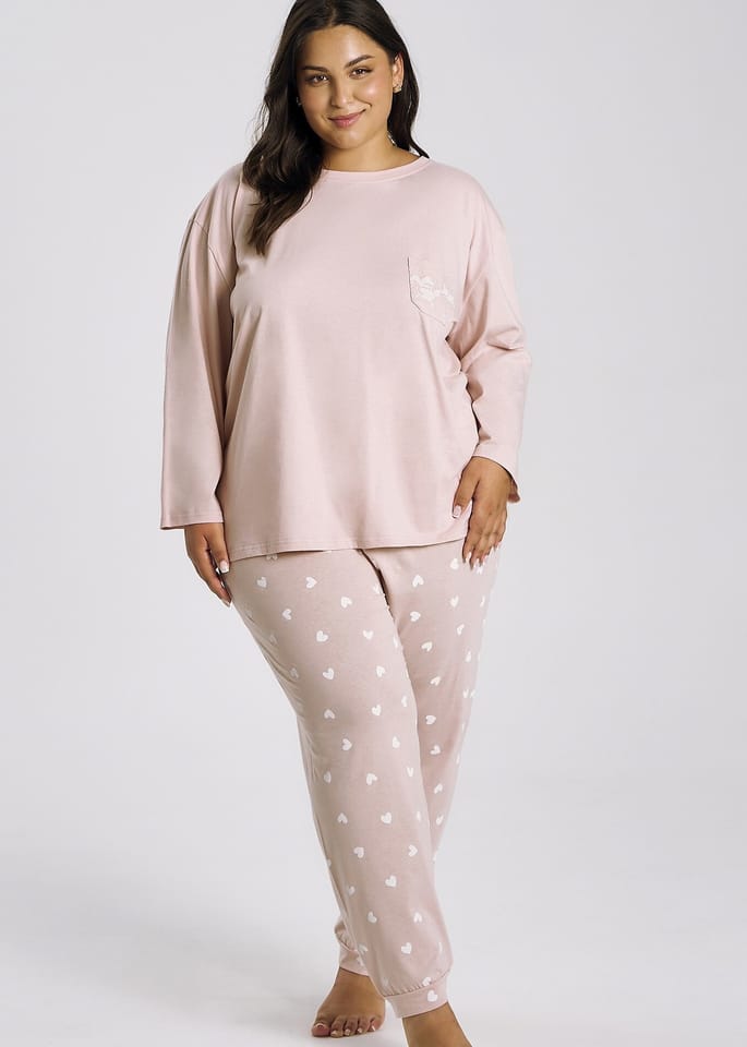 Dwuczęściowa piżama damska z wysokiej jakości bawełny. Koszulka z długim rękawem o luźnym, swobodnym fasonie, półokrągłym dekolemt, na wysokości piersi mała kieszonka. Do kompletu wygodne, wzorzyste spodnie. Skład: 100% bawełna.