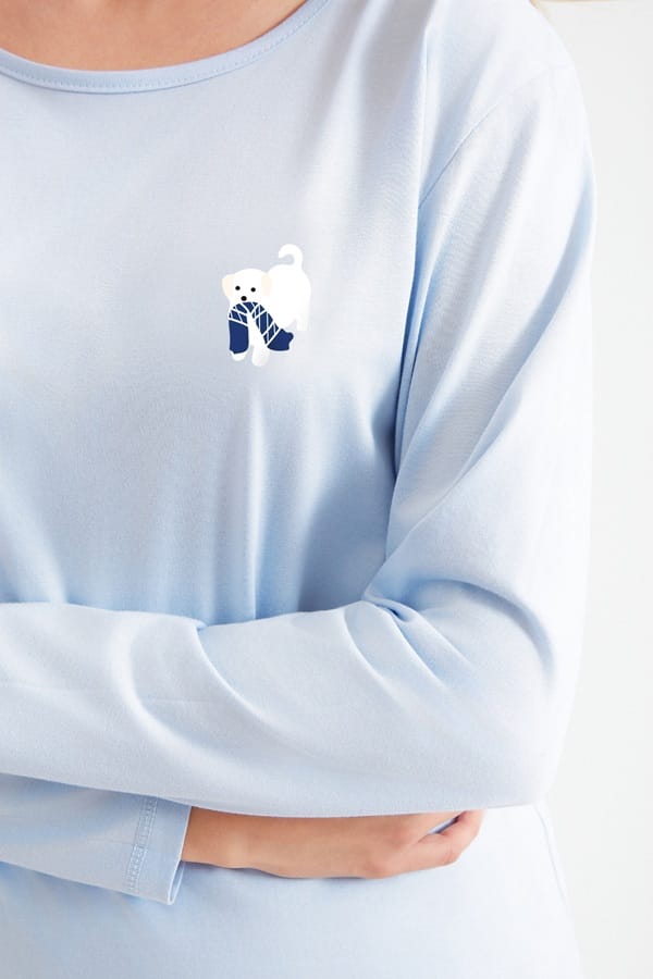 Dwuczęściowy komplet obejmuje jasnoniebieską bluzkę z długim rękawem oraz spodnie w biało-niebieski wzór przypominający ślady łapek. Luźny fason i elastyczna talia zapewniają pełną swobodę ruchów, idealną do odpoczynku w domowym zaciszu.