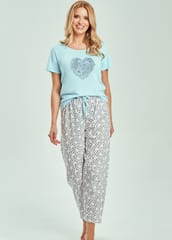 Bawełniana piżama damska jest miękka, przewiewna i przyjemna w dotyku. Koszulka z krótkim rękawem, półokrągłym dekoltem, ozdobiona nadrukiem z przodu. Spodenki wzorzyste 7/8 z gumką w pasie obszytą bawełną. Skład: 100% bawełna.