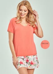 Piżama damska o wygodnym kroju zapewnia swobodę ruchów, a staranne wykonanie gwarantuje komfort użytkowania. Koszulka z miękkiej, oddychającej wiskozy. Spodenki krótkie z delikatnym, kwiatowym motywem. Skład:góra: 94% wiskoza, 6% elastan,dół:100% bawełna.