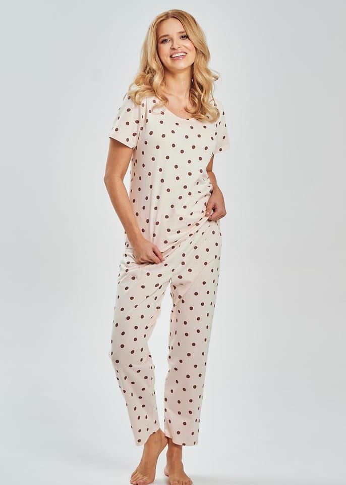 Bawełniana piżama damska jest miękka, przewiewna i przyjemna w dotyku. Koszulka z krótkim rękawem, półokrągłym dekoltem, ozdobiona wzorem w grochy. Spodnie o długości 7/8 z gumka w pasie obszytą bawełną. Skład: 100% bawełna.