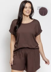 Piżama damska o luźnym kroju wykonana z delikatnej wiskozy, która jest miękka, przewiewna i przyjazna dla skóry. Koszulka z krótkim rękawem, półokrągłym dekoltem. Do kompletu spodenki z gumką w pasie obszytą bawełną. Skład: 93% wiskozy, 7% elastan.