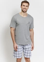 Bawełniana piżama męska. Koszulka z krótkim rękawkiem i półokrągłym dekoltem oraz małym nadrukiem na piersi. Do kompletu krótkie spodenki w kratkę z wygodną gumką w pasie.Skład: koszulka 80% bawełna, 20% poliester; spodenki 100% bawełna.