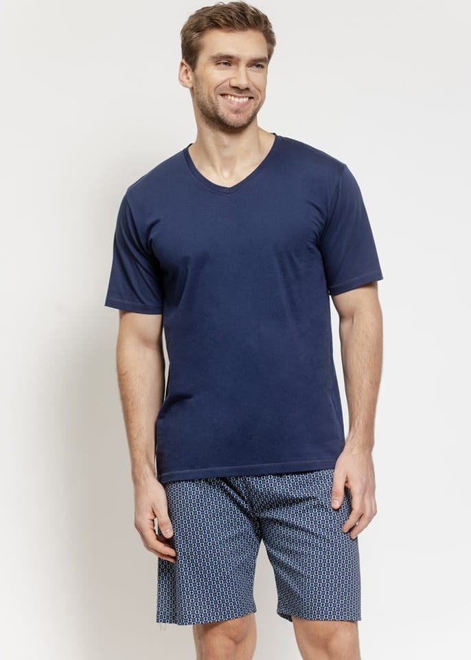 Bawełniana piżama męska. Koszulka z krótkim rękawkiem i dekoltem V. Do kompletu krótkie spodenki, wzorzyste, z wygodną gumką w pasie. Skład: 100% bawełna.